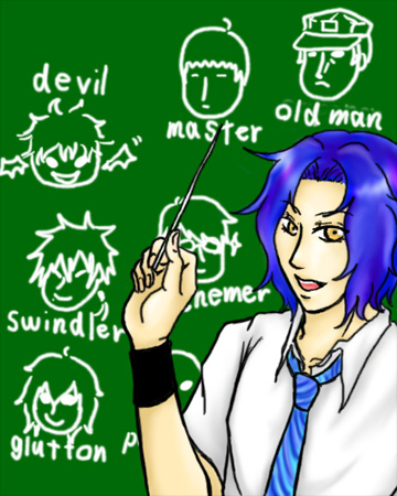 「はーい、皆こっち見て。Look up a black board.左から、devil, master,
